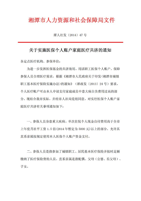 關(guān)于實(shí)施醫(yī)保個(gè)人賬戶家庭醫(yī)療共濟(jì)的通知