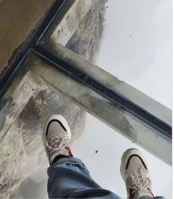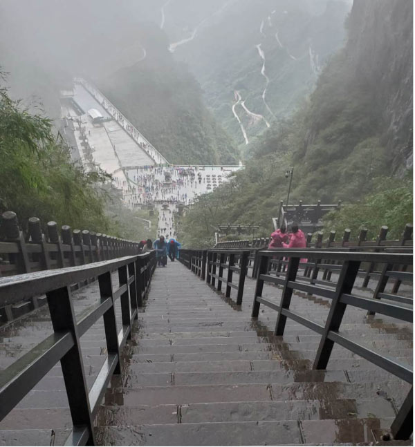 于是在我們又轉(zhuǎn)了7層電梯后,終于來到了天門洞上。依然是白茫茫的一片,天門山棧道,底下原本高聳陡峭的山崖,在白霧的襯托下,一點(diǎn)兒也不讓人覺得害怕了,只是雨天濕滑,內(nèi)心在默默祈禱千萬不要摔倒就好。